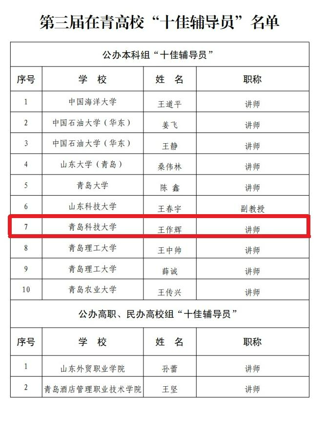 在第三届在青高校“十佳思政名师”和“十佳辅导员” 评选活动中,365英国上市辅导员王作辉获评在青高校“十佳辅导员”荣誉称号。