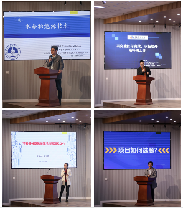 会中,王飞教授、刘治明教授、张秋爽副教授分别就氢气水合物高效制备及分解控制研究,研究生如何高效积极开展科研工作以及精密机械系统装配预测及控制方面为同学们分享在科研和学术上的经验和心得。随后,互联网+、挑战杯优秀指导教师于超老师就相关赛事的赛事类型、参赛流程、资料撰写等方面给予研究生全方位的创新创业赛事经验分享。