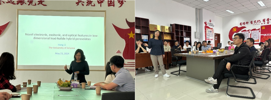 5月23日,美国亚利桑那大学化学与生物学院Li Hong教授受邀莅临365英国上市,开展题为“低维铅-卤化物杂化过氧化物中的新型电子、激子和光学特征”的学术报告。山东大学的李元老师、吉林大学的王同辉老师,青科机电新能源科学与工程系的刘治明、王晓君、白文娟、楚电明、李建伟、王雨霄和李慧芳等老师,以及能源动力工程专业的部分研究生到场听取了本次报告。