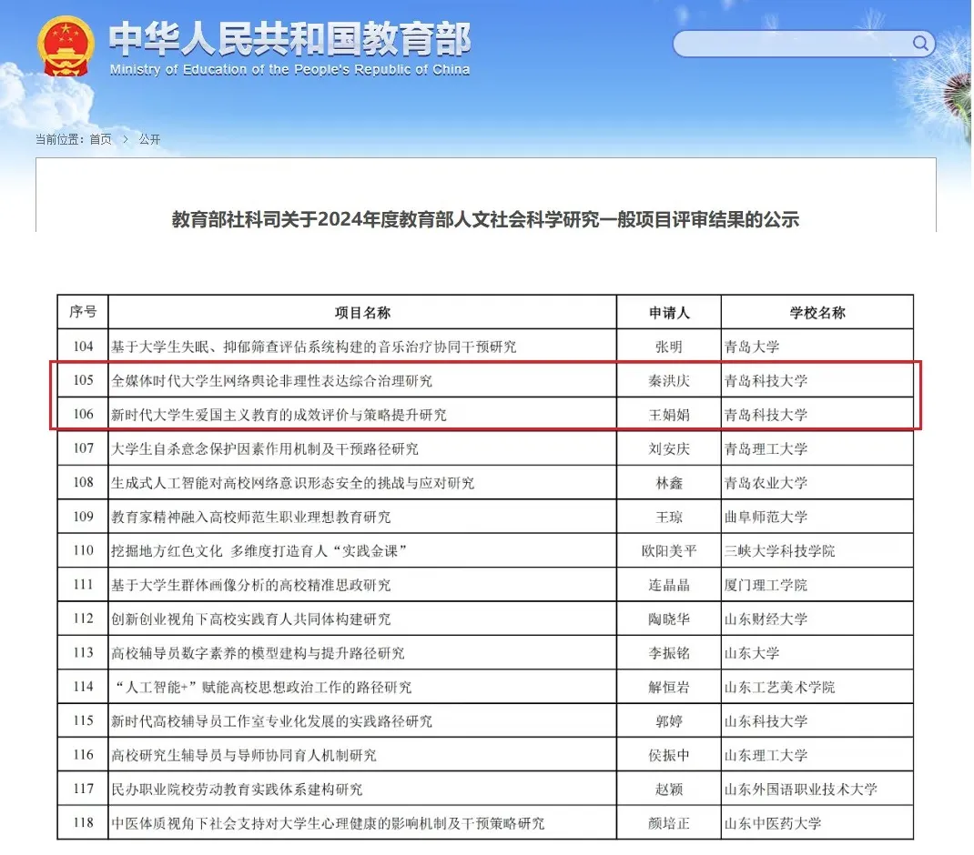 近日,教育部社会科学司公布了2024年度教育部人文社会科学研究专项任务项目(高校辅导员研究)的评审结果,时任学院学工办主任、团委书记王娟娟主持的《新时代大学生爱国主义教育的成效评价与策略提升研究》获批立项,实现学院该项目历史性突破。